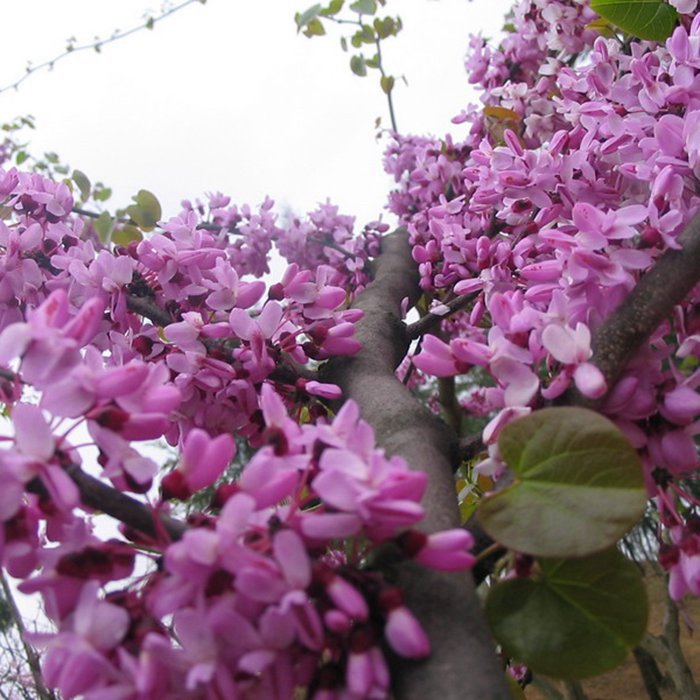 落葉灌木或小喬木,高達(dá)15米。叢生,樹(shù)皮幼時(shí)暗灰色、光滑,老時(shí)粗糙呈片裂。單葉互生,全緣,近圓形,先端尖,基部心臟形,表面光滑有光澤,葉主脈掌狀,5~7條,背面隆起。為莖花植物,4月先葉開(kāi)花,紫紅色,4~10朵簇生于枝條或老干上。果期8~9月,莢果扁平。變種白花紫荊(cv.alba),花白色。